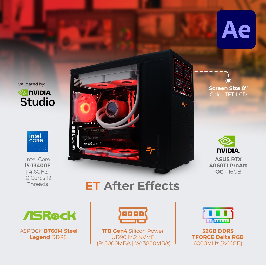 ET After Effects adalah PC khusus yang dirancang untuk keperluan produksi video dan animasi. PC ini dilengkapi dengan perangkat lunak Adobe After Effects yang sudah diinstal sebelumnya, memungkinkan pengguna untuk langsung memulai pembuatan efek visual dan animasi tanpa perlu repot menginstal aplikasi tambahan. Keunggulan dari ET After Effects sebagai berikut: