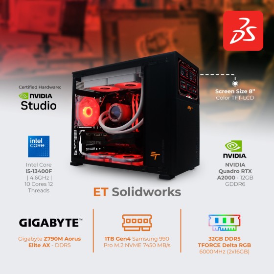 ET Solidworks adalah PC khusus untuk tugas desain dan rekayasa mekanik, dilengkapi dengan perangkat lunak Solidworks yang sudah terinstal sebelumnya untuk memudahkan pengguna memulai pekerjaan desain. Keunggulan dari ET Solidworks sebagai berikut: